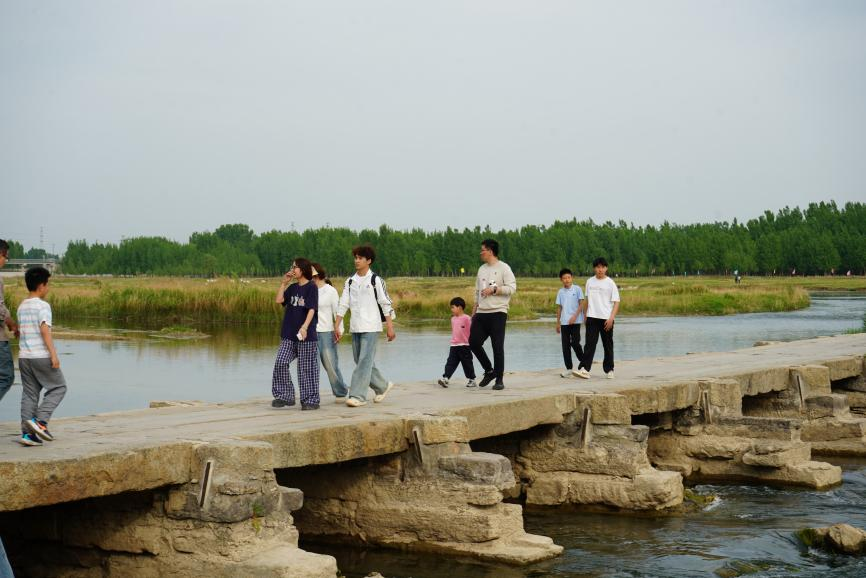 研学途中,大汶口古镇的烟火气息与明石桥的古朴厚重,为师生们带来了别样的文化体验。作为山东省境内现存最长、最古老的古石桥之一,明石桥始建于明代,全长570.95米,由泰山花岗岩条石铺就,其独特的“S”型漫水设计与铁制扒锔嵌接工艺,彰显着古代工匠的高超技艺,更承载着“双脚踏齐鲁”的地域文化内涵。师生们漫步桥上,触摸着历经岁月沧桑的石条,远眺汶水汤汤,在古桥与古镇的交融中,感受大汶口地区的历史传承与人文底蕴,进一步深化了对泰山石文化地域延伸的理解。